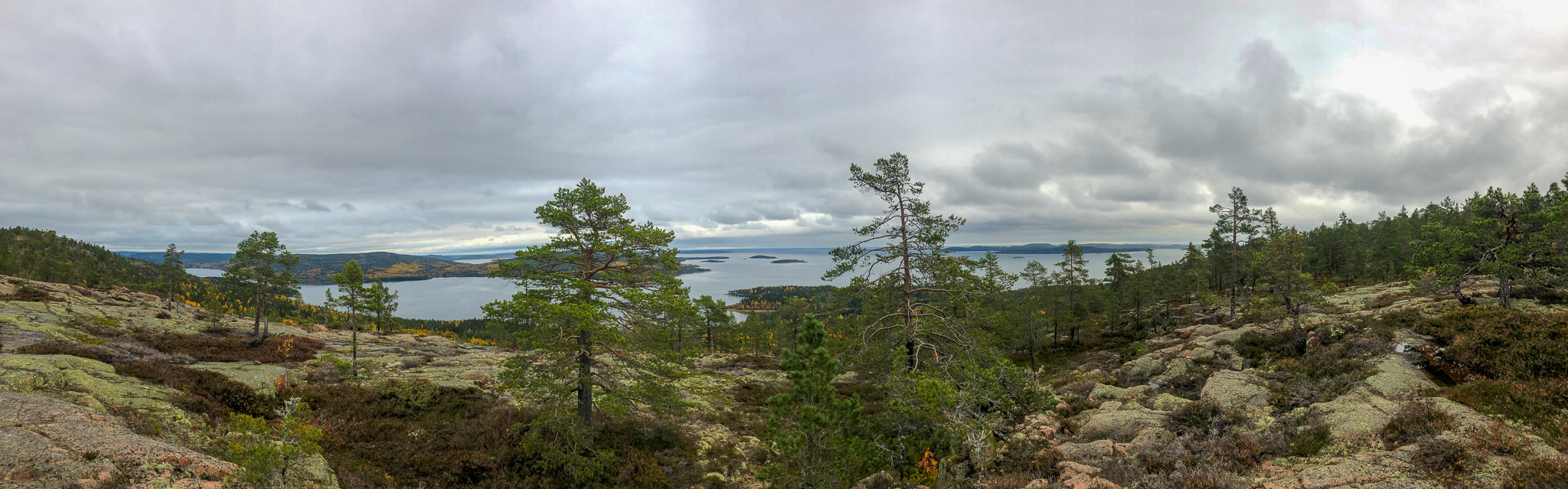 Nur weniger Schritte von den Seen entfernt lichteten sich die Bäume und es offenbarte sich uns eine wunderschöne Aussicht. Nach dem Geniessen kam der Abstieg. Auf der Karte zwar bemerkt, jedoch mit einem «Aba, wird schon geh’n» abgetan, ging’s schier senkrecht nach unten. So kletterte Lukas mit, und Andrea ohne viel Freude über die Felsen Richtung Meer. Unten angekommen, mussten wir witterungsbedingt einen Zahn zulegen wodurch Hirvigo uns noch beinahe trocken in Empfang nehmen konnte.